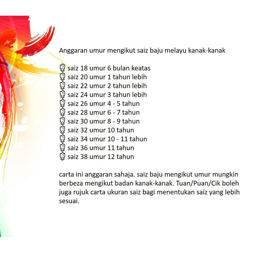 Discover (and save!) your own pins on pinterest. Gaun umur(tahun) 1 2 3 4 5 6 7 8 9 bahu 8.5 9 9.5 10 10.5 11 11.5 12 . 20+ ide ukuran baju melayu budak. Discover (and save!) your own pins on pinterest. Saiz baju melayu kanak kanak mengikut umur, pola baju kanak kanak,. Index of wp content uploads 2018 04 . Ni pola baju kurung princess yg florabeadz buat. Jika umur anak 6 tahun boleh rujuk carta ukuran 4, 6 dan 8 tahun. Baju melayu kanak2 jenama : Nova men's harga rm 50.00 saiz :